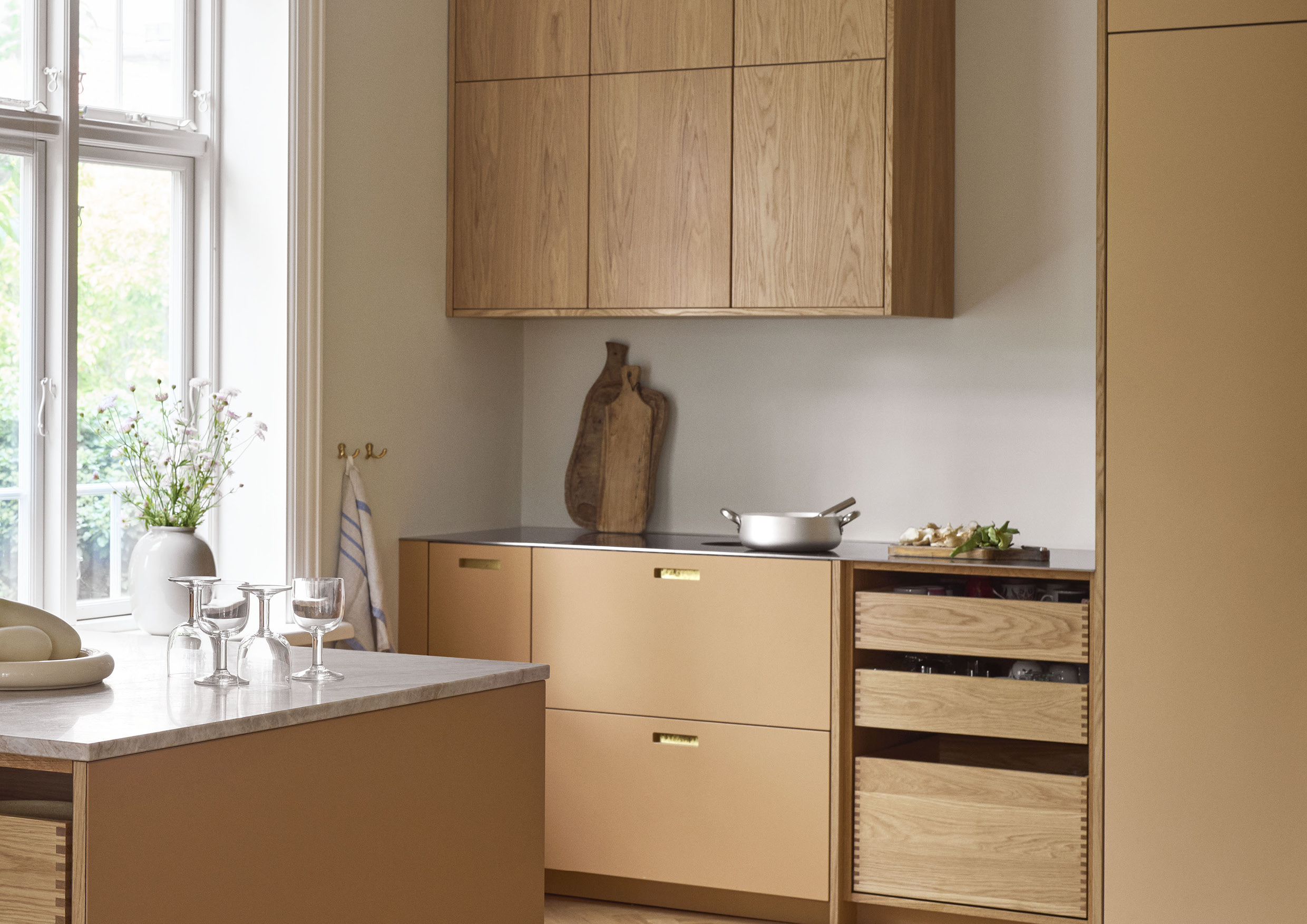 Signaturgreb med messingbagplader. Overskabe i eg uden greb.